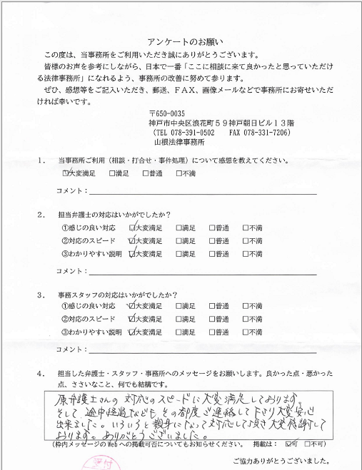 当事務所では、すべての事件が終了した際に、依頼者様からアンケートにご協力いただいております。今回は、交通事故事件で先日終了した案件にご協力くださったお客様からの声を一部ご紹介いたします。